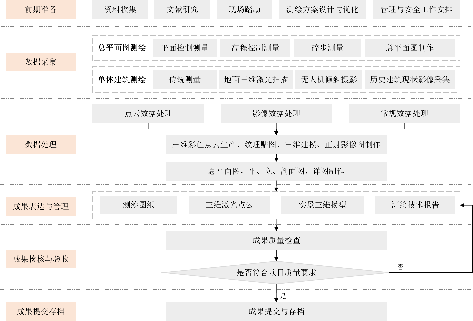歷史建筑測繪的工作流程分為前期準(zhǔn)備、數(shù)據(jù)采集、數(shù)據(jù)處理、成果表達(dá)與管理、成果檢核與驗(yàn)收、成果提交存檔等五個(gè)階段。
