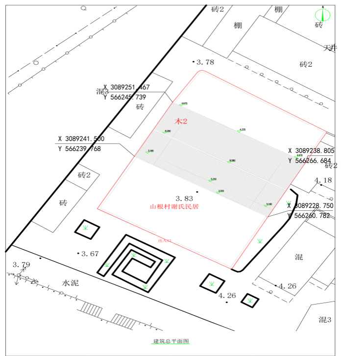 總平面圖:繪制建筑輪廓、周邊建筑或構(gòu)筑物、道路、廣場、水域、山體、綠化等環(huán)境信息,且完整覆蓋歷史環(huán)境要素;標(biāo)注建筑總尺寸,建筑與相鄰建筑物、構(gòu)筑物的距離;場地標(biāo)高與建筑、構(gòu)筑物的標(biāo)高,平屋面建筑標(biāo)注天面、女兒墻的標(biāo)高,坡屋面建筑宜標(biāo)注屋脊、檐口下沿的標(biāo)高;標(biāo)注建筑名稱、出入口位置、層數(shù)、建筑高度、周邊建筑的層高、周邊道路、廣場名稱等信息。