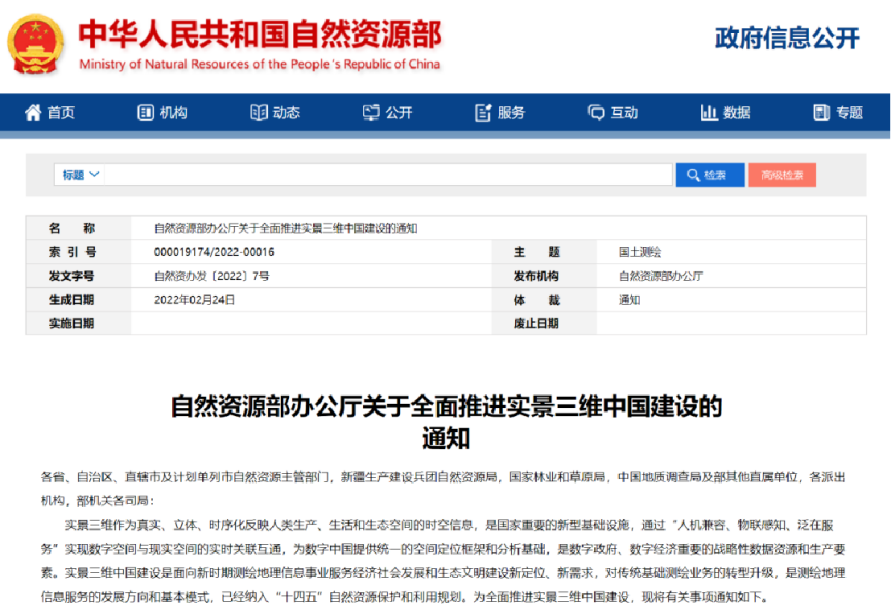 2022年2月24日,自然資源部辦公廳印發(fā)了《關(guān)于全面推進(jìn)實景三維中國建設(shè)的通知》?!锻ㄖ分赋?,實景三維作為真實、立體、時序化反映人類生產(chǎn)、生活和生態(tài)空間的時空信息,是國家重要的新型基礎(chǔ)設(shè)施,是數(shù)字政府、數(shù)字經(jīng)濟重要的戰(zhàn)略性數(shù)據(jù)資源和生產(chǎn)要素。實景三維中國建設(shè)是面向新時期測繪地理信息事業(yè)服務(wù)經(jīng)濟社會發(fā)展和生態(tài)文明建設(shè)新定位、新需求,對傳統(tǒng)基礎(chǔ)測繪業(yè)務(wù)的轉(zhuǎn)型升級,是測繪地理信息服務(wù)的發(fā)展方向和基本模式,已經(jīng)納入“十四五”自然資源保護(hù)和利用規(guī)劃。