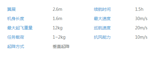 縱橫CW-10大鵬復合翼無人機,翼展2.6米,最大續(xù)航時間90分鐘,最大載荷達2kg,巡航速度為20m/s。同時采用RTK定位,定點起降,精準作業(yè)。在航空測繪、管線巡檢、應急、監(jiān)視等領域有著寬廣的運用。