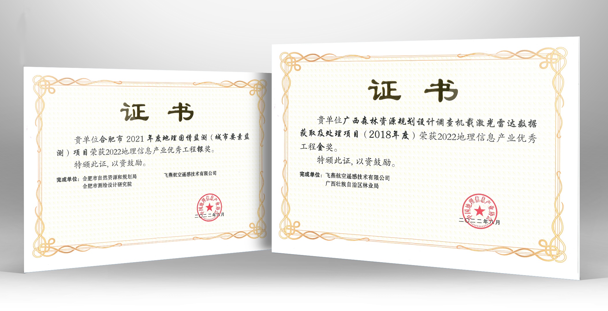 飛燕遙感憑借“廣西森林資源規(guī)劃設計調查機載激光雷達數(shù)據(jù)處理”和“合肥市地理國情監(jiān)測”項目分別榮獲2022年地理信息產業(yè)優(yōu)秀工程獎金獎和銀獎。