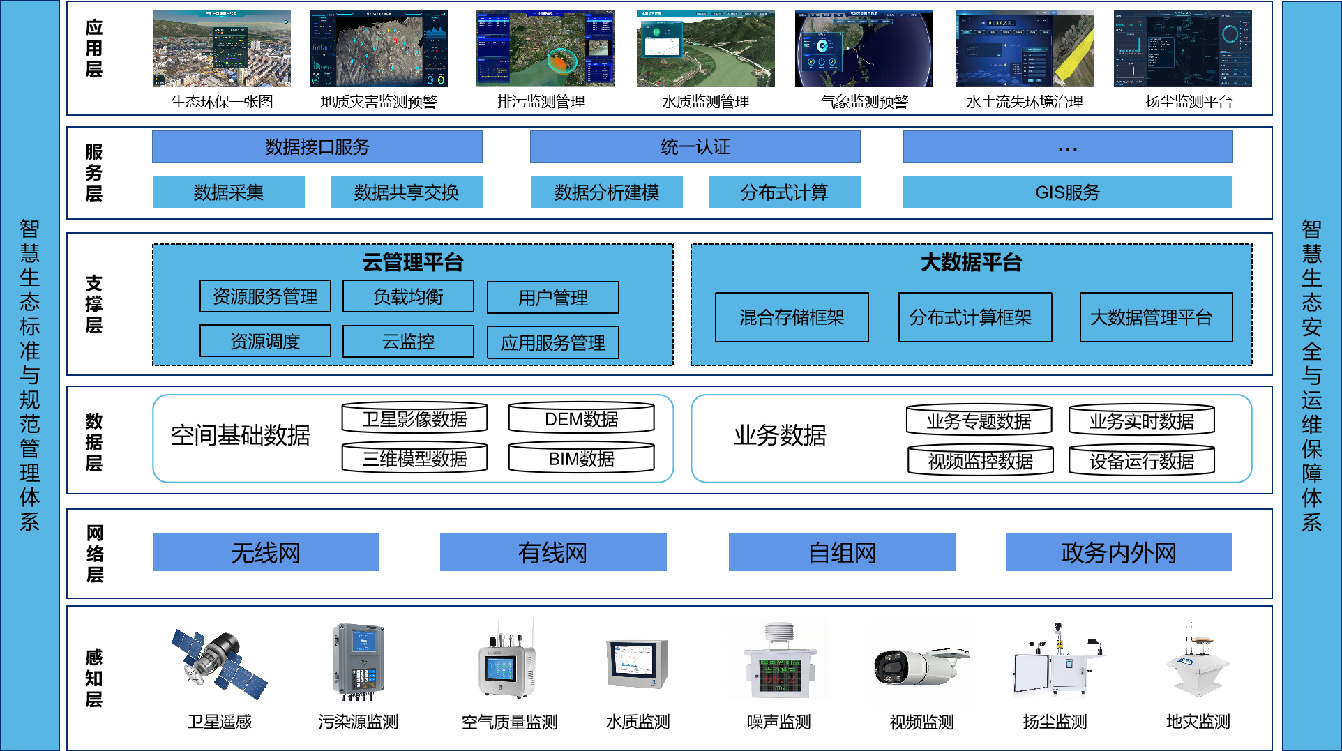 系統(tǒng)整體框架分為基礎(chǔ)設(shè)施層、數(shù)據(jù)層、服務(wù)層、業(yè)務(wù)層和應(yīng)用層,提供具備基于地理空間特征的實(shí)景數(shù)據(jù)底座和監(jiān)測(cè)站點(diǎn)的指標(biāo)信息服務(wù)。