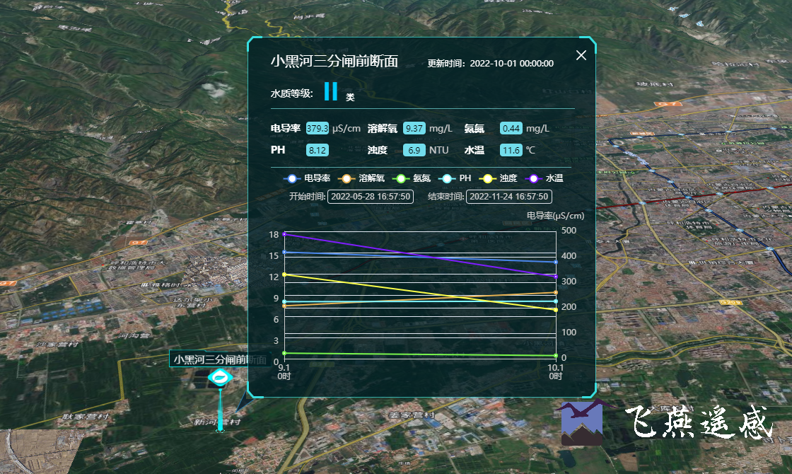 本系統(tǒng)通過(guò)自有無(wú)人機(jī)設(shè)備獲取了測(cè)區(qū)20km2的3.5cm分辨率數(shù)據(jù),制作了數(shù)字高程模型DEM、衛(wèi)星影像、傾斜模型等數(shù)據(jù),構(gòu)建了三維場(chǎng)景底座,并結(jié)合國(guó)控站點(diǎn)指標(biāo)監(jiān)測(cè)等功能為用戶(hù)提供輔助決策支持,以達(dá)到科學(xué)管理的目的。