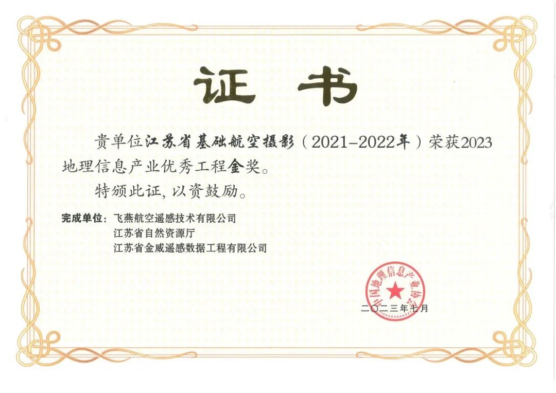 憑借《江蘇省基礎(chǔ)航空攝影》項目榮獲2023地理信息產(chǎn)業(yè)優(yōu)秀工程金獎。