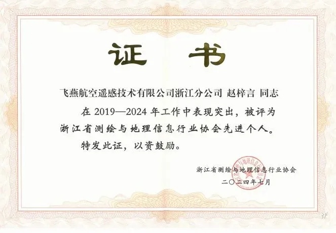 秉持“艱苦奮斗、開拓創(chuàng)新、守望相助、永攀高峰”企業(yè)核心價值,飛燕遙感總經(jīng)理趙梓言榮獲浙江省測繪與地理信息行業(yè)協(xié)會先進個人。
