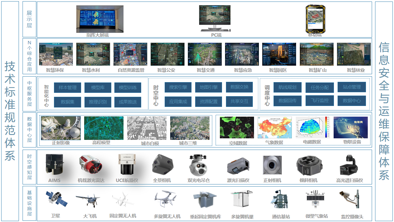 在遙感數(shù)據(jù)獲取方面,針對中高空、低空遙感分別自主研發(fā)了AIMS多模態(tài)航攝儀與“遠瞰”低空無人值守系統(tǒng)。在一次性獲取所有主流航空遙感數(shù)據(jù)的基礎(chǔ)上,實現(xiàn)無人機自動巡檢、自動充電、異地部署、遠程規(guī)劃指揮、數(shù)據(jù)自動回傳等功能,滿足城市區(qū)劃范圍內(nèi)山水林田湖草沙全場景作業(yè)需求。
