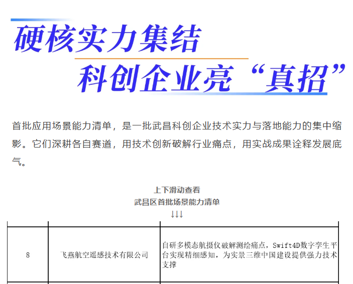 近日,飛燕航空遙感技術(shù)有限公司(以下簡稱“飛燕遙感”)憑借其卓越的“空天地一體化”技術(shù)實(shí)力,成功入選武漢市武昌區(qū)首批應(yīng)用場景能力清單。