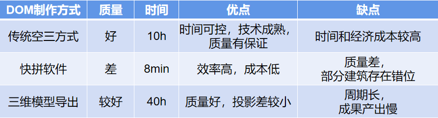 從三種方式制作的正射影像可以看出,質(zhì)量方面?zhèn)鹘y(tǒng)空三方式制作的正射影像和通過三維模型導(dǎo)出的正射影像精度較好,快拼影像質(zhì)量要差一些,尤其是高層建筑投影差明顯,甚至?xí)霈F(xiàn)錯位現(xiàn)象。三種方式制作正射影像的優(yōu)缺點如所示