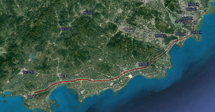 汕汕高速鐵路是廣東省重點工程,也是國家“八縱八橫”沿海高鐵通道的重要組成部分,由汕頭站至汕尾站,經(jīng)汕頭市(龍湖區(qū)、濠江區(qū)、潮陽區(qū)、潮南區(qū))、揭陽市(大南海石化工業(yè)區(qū)、惠來縣)、汕尾市(陸豐市、海豐縣、東涌鎮(zhèn)),終于廈深鐵路汕尾站。正線全長162.750千米,全線設(shè)7座車站。
