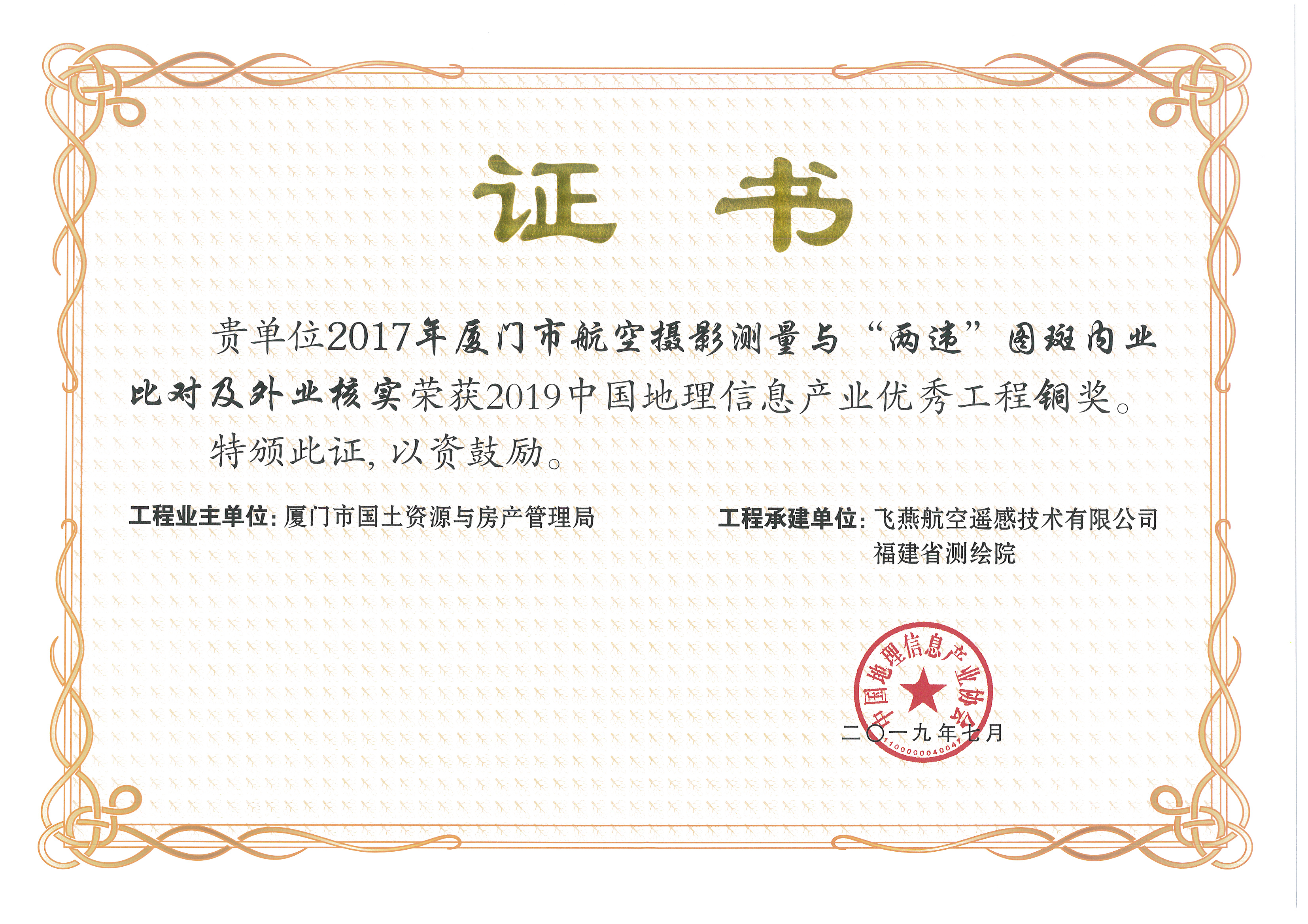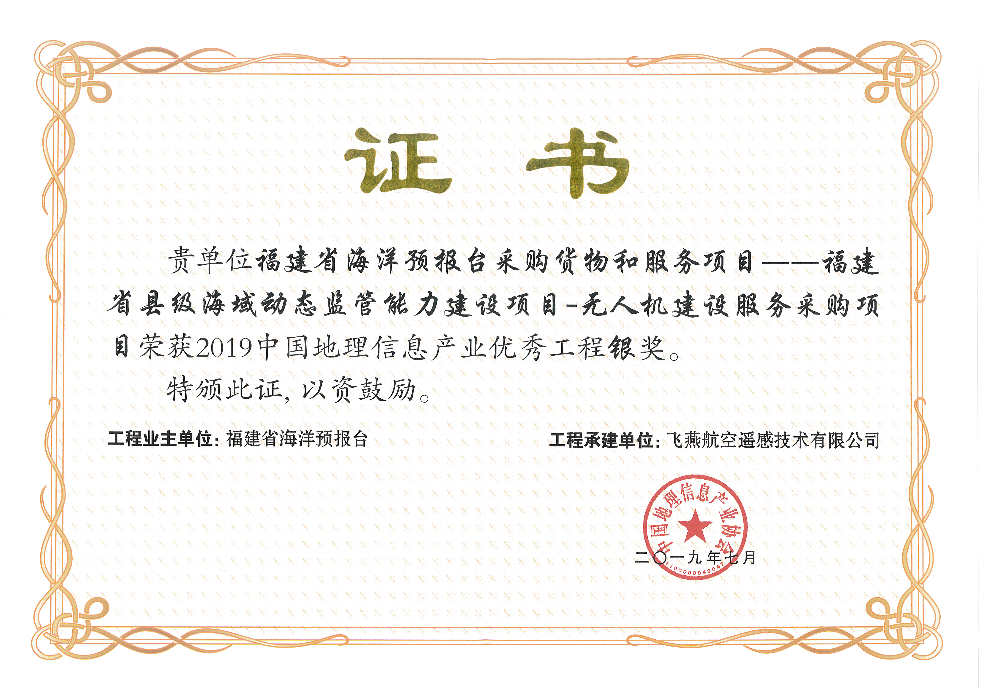 圖 飛燕遙感榮獲國家優(yōu)秀工程獎證書